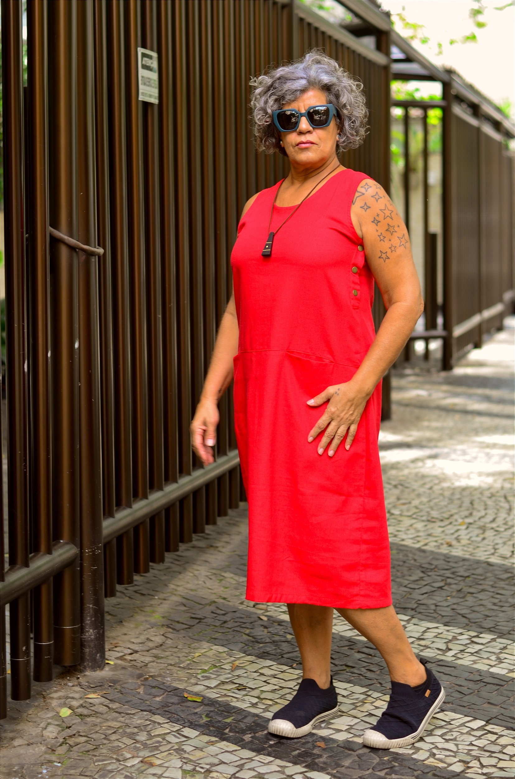 Vestido com bolsos na frente e abotuamento com botão de prssão abaixo da cava.